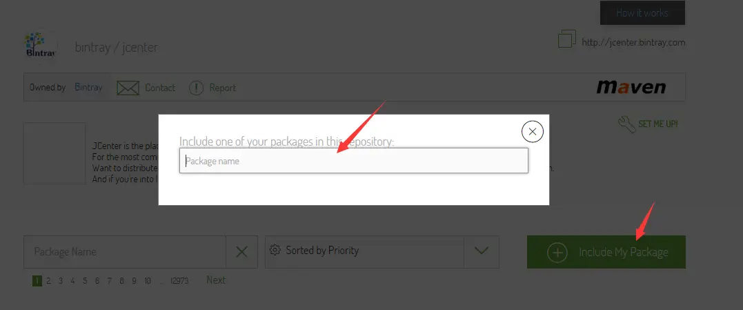 上传完成即可在Bintray网站上找到你的Repo,我们需要完成最后一步工作,申请你的Repo添加到JCenter。可以进入这个页面,点击Include My Package,输入你的项目名字,点击匹配到的项目,直接send即可,然后就等管理员批准了。