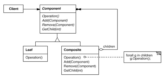 public abstract class Component { public abstract void Operation(); public abstract void Add(Component c); public abstract void Remove(Component c); public abstract Component GetChild(int i); } -