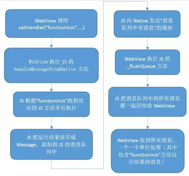 }webView.flushMessageQueue()首先去执行Js的_flushQueue()方法,并附带着CallBackFunction。Js的_flushQueue()方法会把sendMessageQueue中的所有message都回传给Java层。CallBackFunction就是把messageQueue解析出来后一个一个Message在for循环中处理,也正是在for循环中,”functionInJs”的Java层回调方法被执行了。