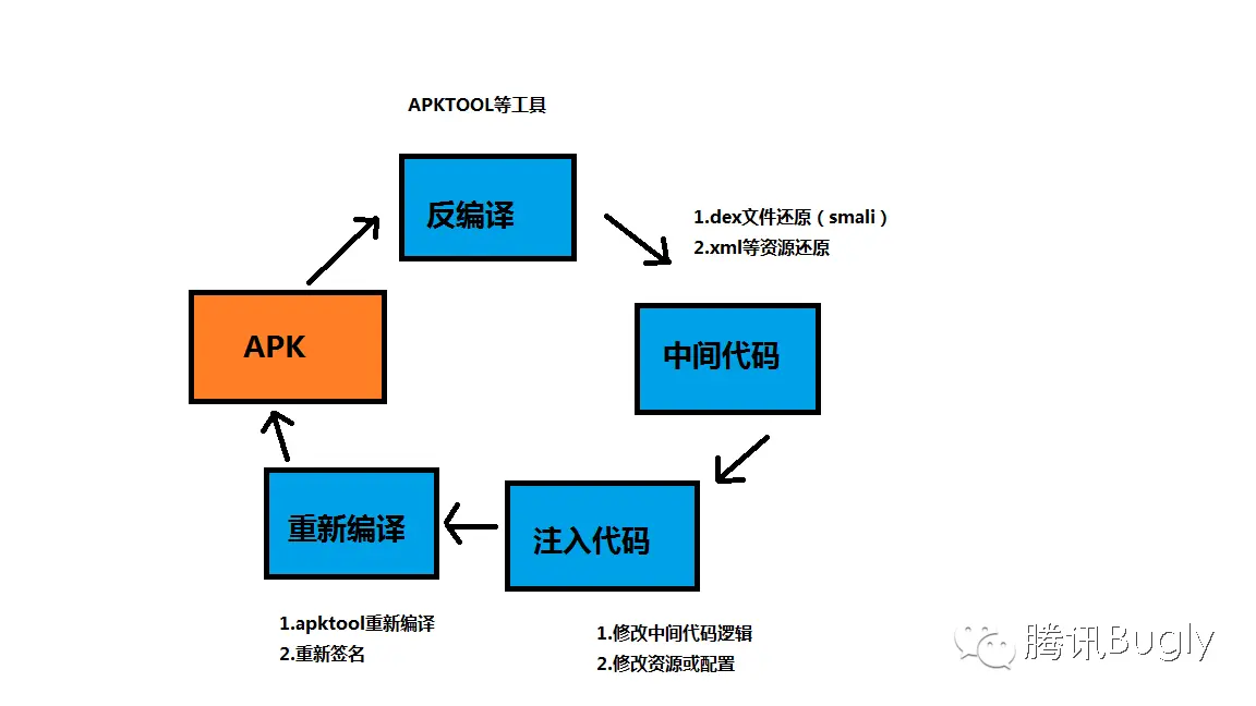 上图为一般 Apk 的破解过程(windows 画图工具画的比较搓)。