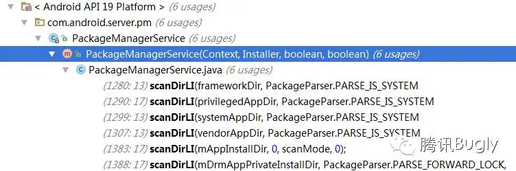 这里 mPackages 是 hashMap,其调用put方法的时机是在 scanPackageLI 方法中,而 scanPackageLI 的调用地方是在程序安装和替换函数中,还有就是 scanDirLi 中,代码略。