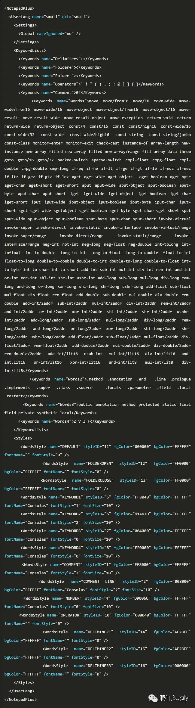 我们可以打开一个 smali 文件看看,我们可以使用 notepad++ 打开,然后定一下 smali 语法的高亮显示。