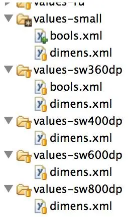 我们并不一定需要将 bools.xml 文件放入 values-sw400dp 文件夹中, 因为Android操作系统会自动按相应路径搜索. 例如一个设备宽 600dp (600/160=3.75 英寸) 操作系统会在values-sw600dp 和其对应文件夹中搜索 bools.xml 文件, 若没有找到则搜索 values-sw400dp 文件夹,再没找到就搜索 values-sw360dp 文件夹,以此类推。