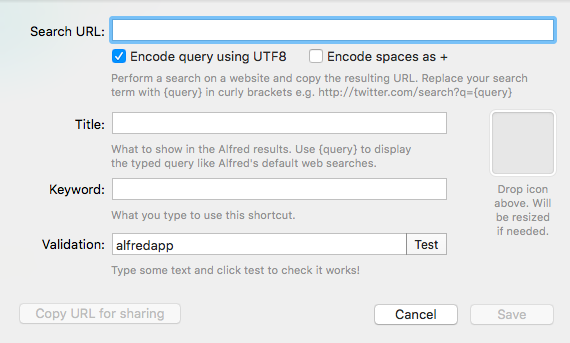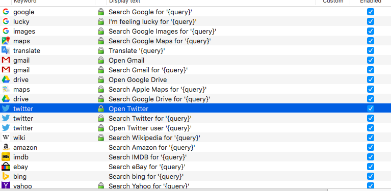 怎么样, google, gmail,twitter 等流行的服务一应俱全,除了这些内置的服务,我们还可以添加自定义的搜索命令,这个就更方便了。这个界面中,我们可以指定搜索 url,以及关键字,图标等信息,这些都设置好之后,我们就可以用我们自定义的命令进行搜搜了: