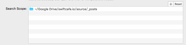 除了这些之外, Alfred 还可以手工指定搜索位置,也就是 Search Scope 中指定的这些目录。比如可以让 Alfred 专门搜索我们正在开发的项目所在的目录,只需要将它的其他默认 Scope 删除,并加入我们自己的项目目录即可: