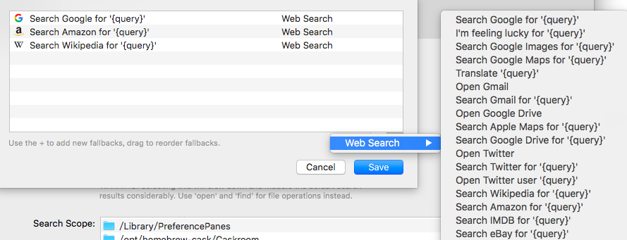 最后呢,你还可以设置一个叫做 Fallbacks 的东西。这个东西的作用呢,就是如果你输入的关键词找不到任何匹配后的默认行为,比如进行 Google 搜索等。Alfred 默认的是 Google,Amazon 和 Wikipedia 三个搜索。当然它还提供了非常多的选项,这就要根据你具体的需求来确定了: