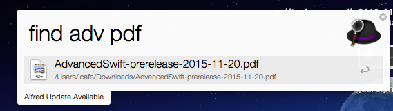 Alfred 还提供了一些搜索命令,让我们更多的控制搜索行为。 比如 find 命令,我们在输入关键词之前加入 find, 然后选择搜索结果后,不是打开这个文件,而是变成了打开这个文件所在的目录: