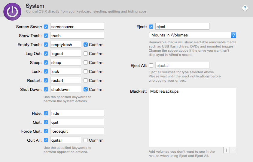 Alfred 还提供了一些常用的系统命令,比如打开屏保,锁屏,睡眠等:
