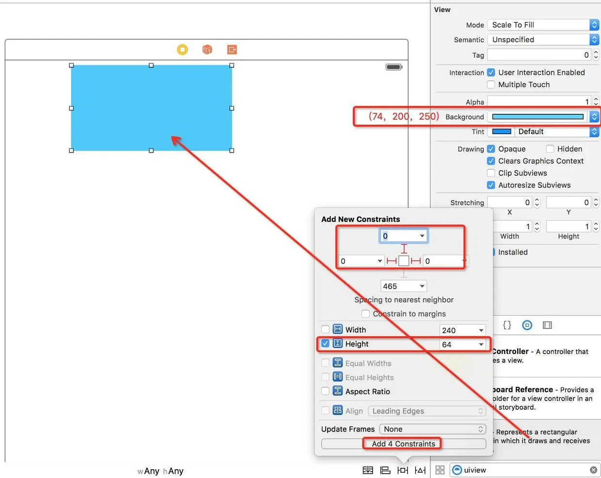 首先我们在故事板中将界面搭建起来,我们从右下侧的控件栏拖出来一个UIView,注意这个UIView一定要拖拉到顶部在状态栏以内,否则你创建的约束顶部将会以状态栏下方开始,比预期的位置下移了20pt
