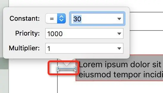 所有的动画都是将一连串的计算展示开来的过程,约束动画也不例外,那么约束是如何计算的呢?以上面的基础约束demo为例,在我们为文本控件添加了约束之后,故事板上的textView多了一些直线,每一条直线代表一个约束。双击这个约束我们可以设置更多东西。