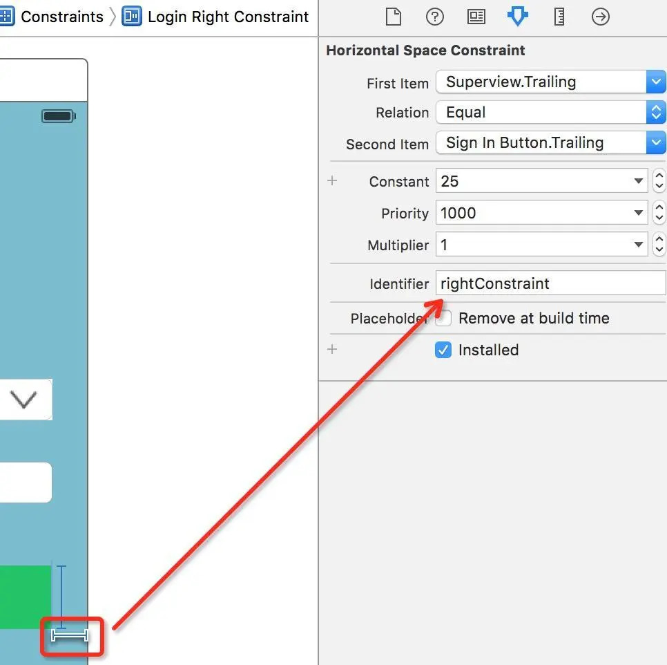 NSLayoutConstraint * rightConstraint = [NSLayoutConstraint constraintWithItem: _signInButton attribute: NSLayoutAttributeTrailing relatedBy: NSLayoutRelationEqual toItem: _signInButton.superview attribute: NSLayoutAttributeTrailing multiplier: 1. constant: -25];