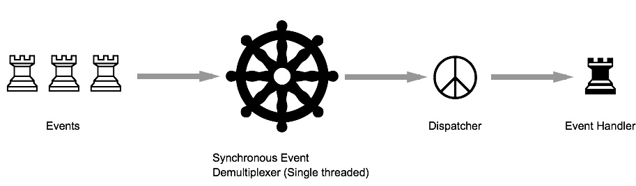 发表自1995年的Reactor模型的基本原理是采用一个单线程事件循环缓存所有系统事件,当事件发生时,以同步方式将该事件发送至处理模块,处理完成后返回结果。基于Reactor模型的EventMachine具备异步(非阻塞)I/O的能力,被广泛用于大部分基于Ruby的事件驱动服务器、异步客户端、网络代理以及监控工具中。