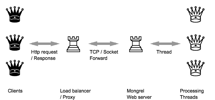 2006年,Zed Shaw发布了划时代的Mongrel。Mongrel把自己定位成一个“应用服务器”,因为其不仅可以运行Ruby Web应用,也提供标准的HTTP接口,从而使Mongrel可以被放置在Web代理、Load Balancer等任意类型的转发器后面,而非像FastCGI、SCGI一样通过调用脚本实现Web服务器和CGI程序的通信。
