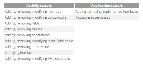 Not all changes will trigger an Activity.recreate() invocation. Should you change something in the AndroidManifest, a new apk has to be built and an incremental install will be performed. In this case the application will be restarted. Application restart will also be done if you replace a superclass or change interfaces that the class is implementing. Here is a full breakdown of activity vs application restart: