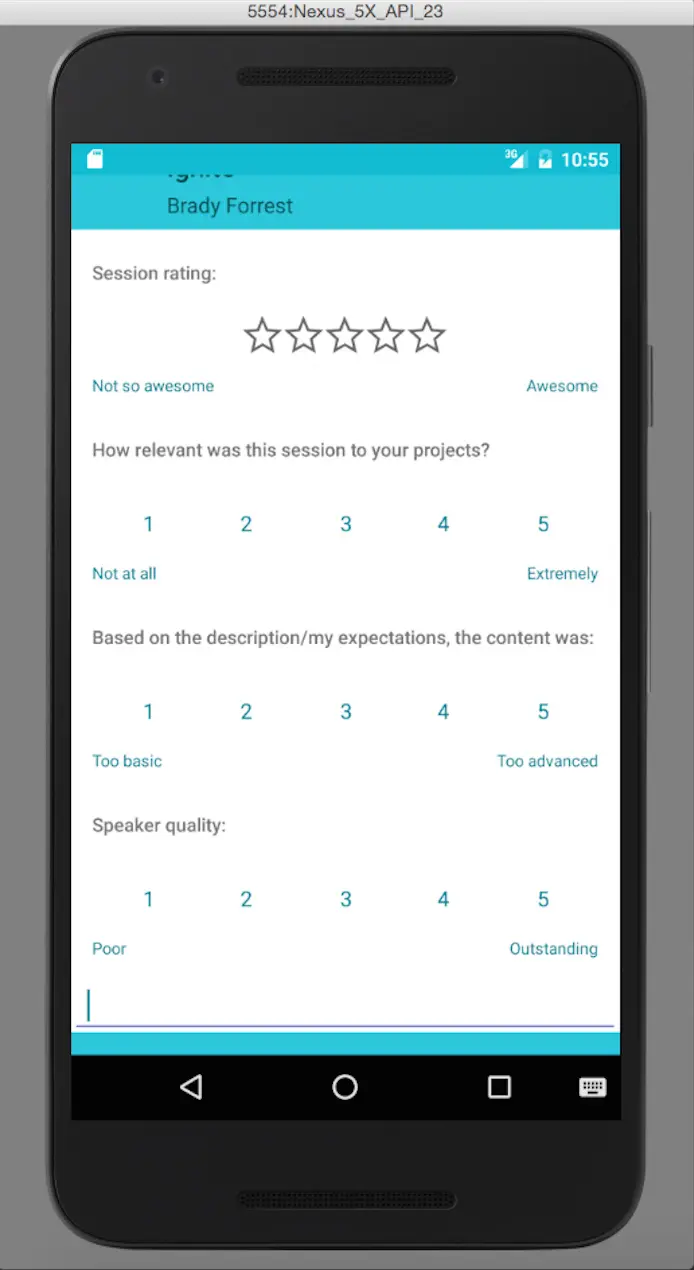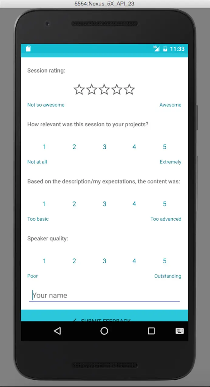 Now let’s make a simple functional change to the application. For each session taking present in GoogleIO you can send feedback. We’ll add one additional element to the question, an input for your name and we’ll use the value from that input in a Toast thanking you for providing feedback.
