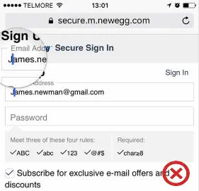 However, you should disable auto-capitalization in email field, because when it’s turned on users might go back and delete the first capital letters as they fear e-mail delivery issues.