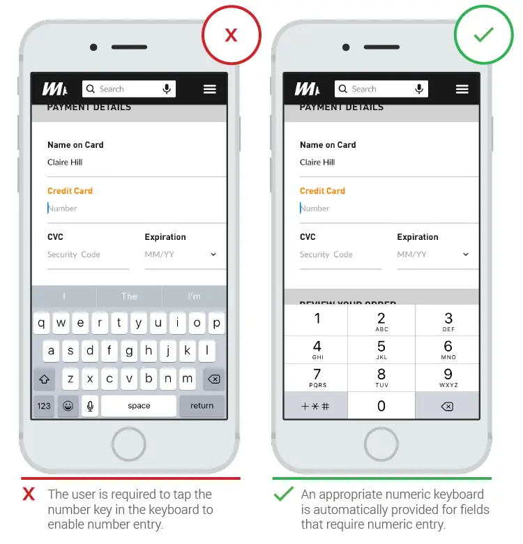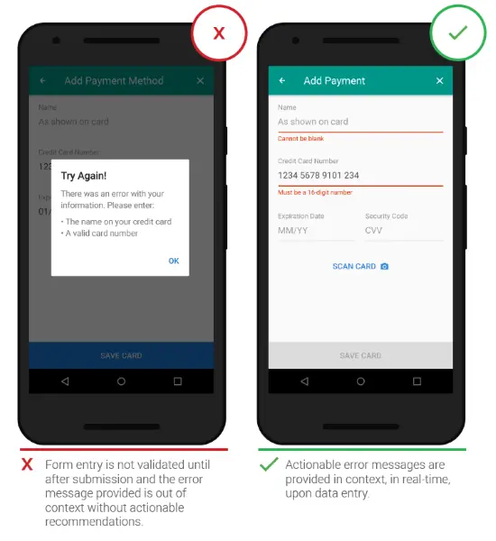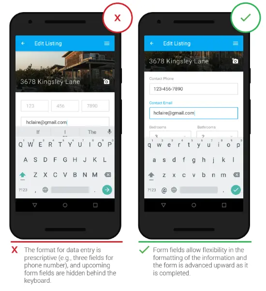 You should make the process of data enter as easy as it possible. Even minor changes such as auto-capitalization or indicating what information goes in each field can significantly increase input field usability together with overall UX. Think deeply about how the user is actually using your mobile app when they’re able to give inputs and make sure you’re not missing something obvious when designing your app.