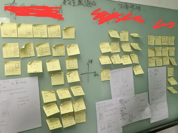 所以头脑风暴最重要的就是让大家无负担的表达自己的想法!最好都不要说话,免得互相影响。我们做头脑风暴的时候把三个关键词写在白板上,然后让参与的同学把想法写在小便签上贴在关键词后面(每个想法对应一个关键词),互相都不说话。
