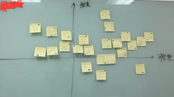 这个时候就要对脑爆的点子进行评估了,拉上做这个项目的设计师和产品经理,最好是大BOSS一起。每个关键词画一个象限表,纵轴叫做解决效果,横轴叫做实现成本,把这个关键词下面的点子往这个象限上贴。