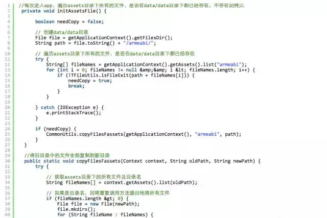 这里需要注意的是:动态加载so的文件只能放在两个地方:1. lib文件夹中,即对应Android Studio中的jniLibs文件夹。2. 本地data/data/package数据目录下。 所以,当应用第一次启动的时候,必须将我们放在assets文件夹中的so文件拷贝乳本地数据目录下。