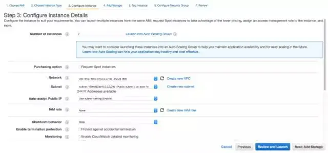 接下来我们移动到Configure Instance标签。我们在这里做的唯一的变化是需要启动七个实例而不是之前的一个。如果你之前有用过EC2服务,那么也许需要改变到你VPC的Network配置。你可以忽略关于自动扩充的组的告警。然而,在你开始于DC/OS上部署生产服务之前,你会想要打开自动扩展组(或者你的平台相关)去确保主机的无痛点恢复。
