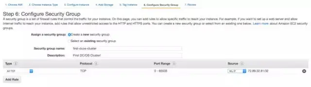 在这个时候,我们需要设置security group。我们将用一个新的security group,并且在Souce的单元格my IP列打开ALL TCP选项。我建议将该security group命名简单用于方便记忆,就像”First DC/OS Cluster“一样。一会功夫,事情就会变得简单了,我们将让所有的节点相互之间自由连接。