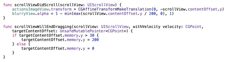 这里为了实现吸附效果,我用到了 scrollViewWillEndDragging(scrollView: UIScrollView, withVelocity velocity: CGPoint, targetContentOffset: UnsafeMutablePointer) 这个方法,它的作用是通知代理用户已经松开手指,现在视图将会以一个速度卷动到一个目标位置,并且这个目标位置是可以用指针修改的。所以我只需判断一下视图将会滚动到什么位置,如果超过一个临界值,就让它完全滚动出来,否则就滚动回去。