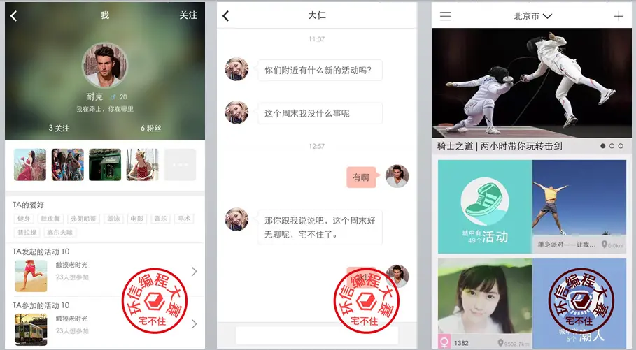 宅不住,发现城市精彩运动,认识周边潮人。类似与周末去哪儿 app, 同时加入了社交模块,即时聊天功能。