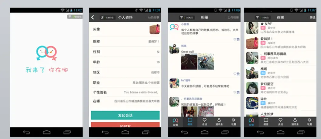 基于环信sdk的陌生人交友android版本开源了---在哪(微话聊) 该项目是改编自环信即时通讯云的demo改编,新增了一些功能 环信即时通讯云demo包含了一个接近微信的完整的聊天app的所有功能, 包括发文字,表情,图片,语音,位置,群聊,登录,注册,退出登录等。