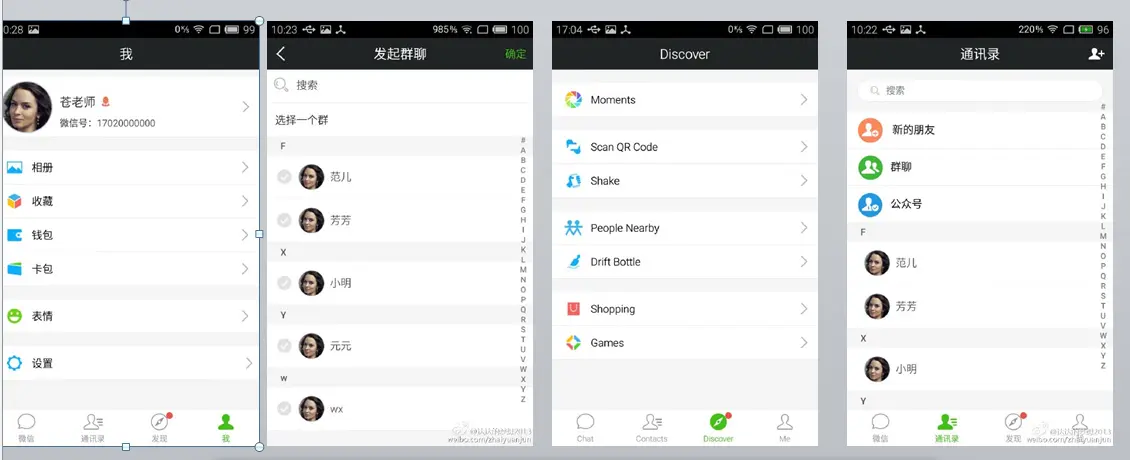 消息:订阅号、列表滑动删除、TitleBar弹出菜单单聊,群聊(发送文字,语音,位置,视频,文件,语音电话,视频通话)微信表情、