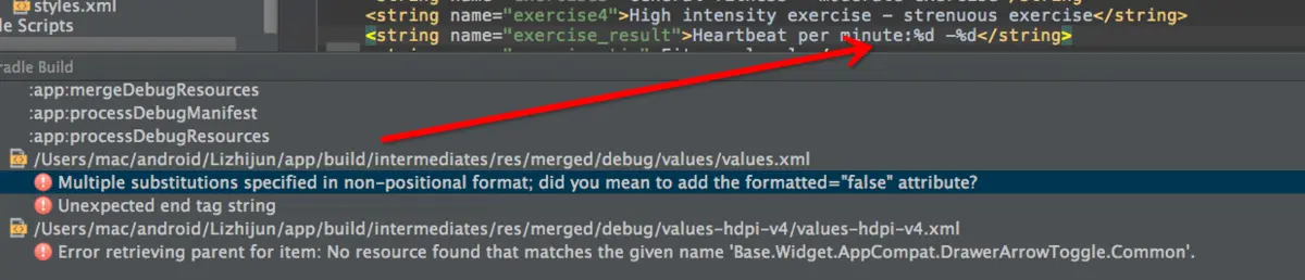 Type error: Multiple substitutions specified in non-positional format; did you mean to add the formatted=”false” attribute?