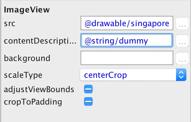 ImageView然后添加@string/dummy到它的contentDescription属性中. - 在 Inspector 面板中, 还可以看见