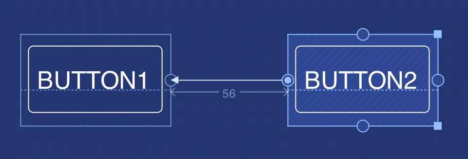 约束帮助你保持控件对齐. 你可以使用锚点(比如下图展示的约束手柄)来确定各控件之间的对齐规则. 例如, 设置一个从 button 2 的左手柄到 button 1 的右手柄的约束(见下图A)意味着控件 button 2 将会位于 button 1 右边 56dp 处.