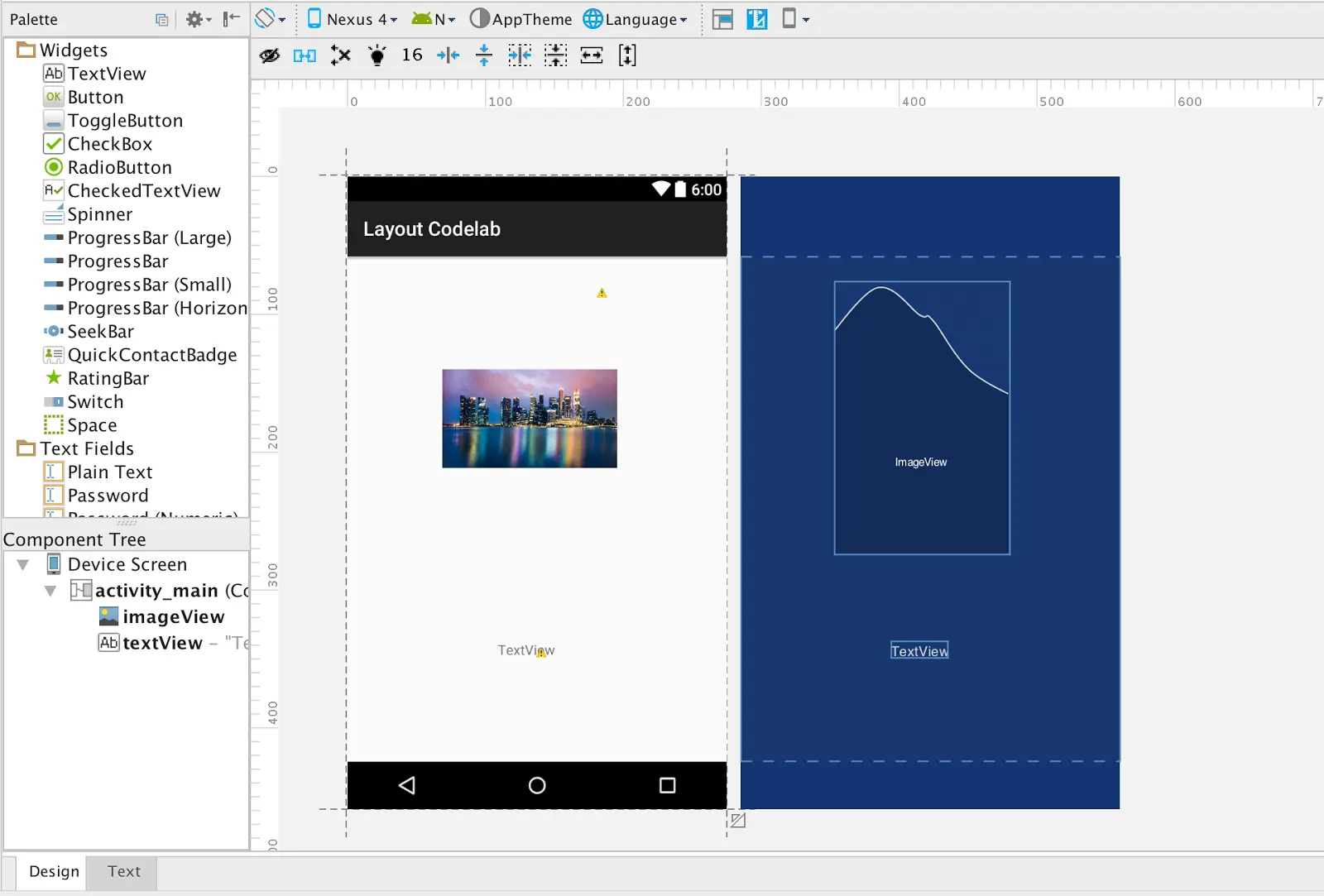 对于这一步, 我们从 layout/activity_main_inference.xml 布局开始. 在 Design 视图中打开布局文件. 默认情况下, 此文件中的布局定义如下: