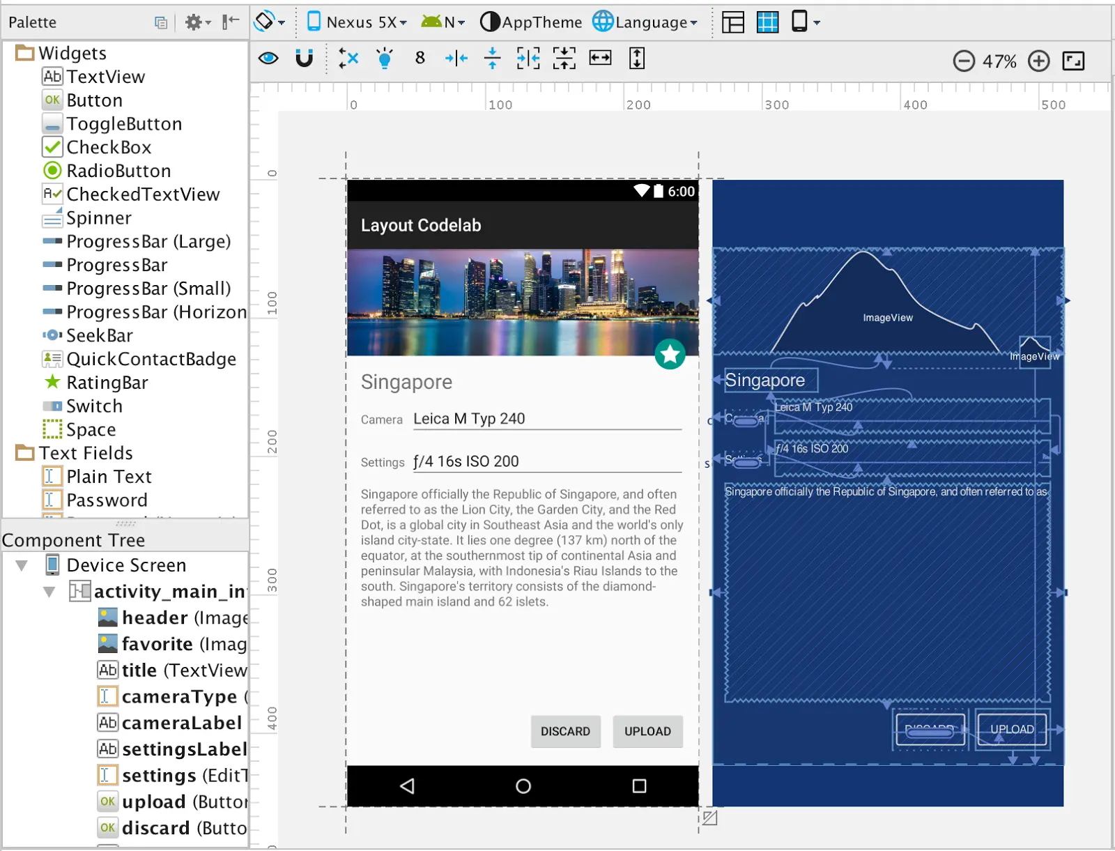 我们的目标是是为图片的描述添加一个 TextView. 我们已经有一个多行的字符串资源 @string/singapore_description.
