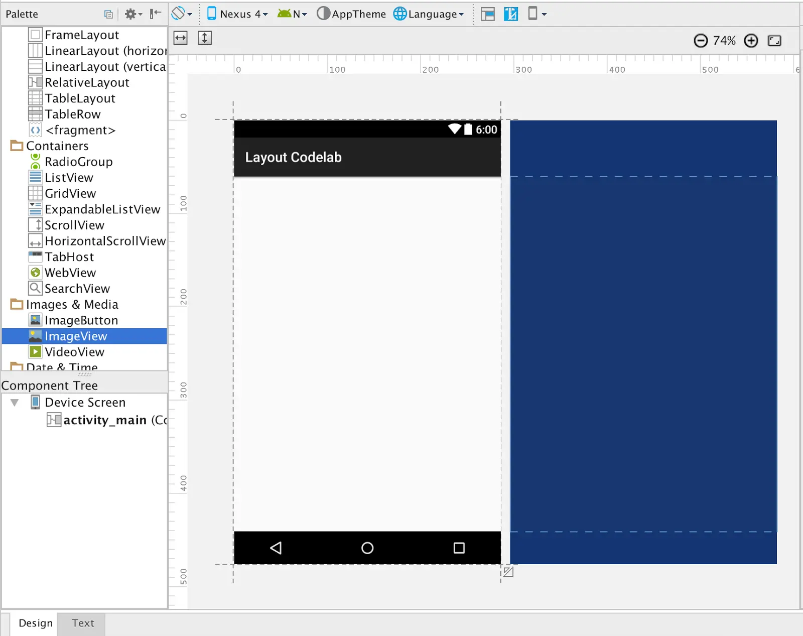 第一个任务是添加一个 ImageView 到布局中. 在设计窗口, 找到控件选择板上的 ImageView 拖入布局.