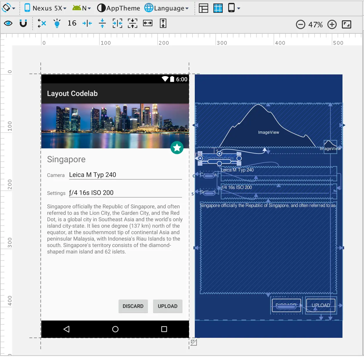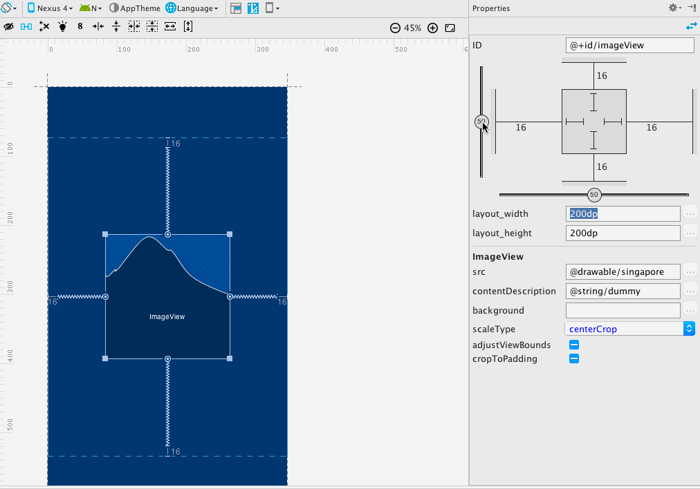 @drawable/singapore和@drawable/ic_star的ImageViews.ic_star图片已经被约束垂直偏量 81%. 你可以通过选中控件查看 Inspector 面板的方式查看包含ic_star的ImageView的垂直偏量, 如之前讨论的一样. - 大 ImageView (