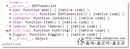 在Firebug控制台结果中,我们还看到了toString()方法。实际上,Chrome浏览器也有(未直接显示),IE10也有,不过,似乎来自层级更高对象的继承。从下面截图中的属性颜色区分可见一斑: