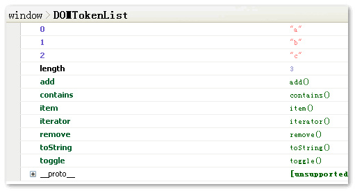 部分现代浏览器,例如Chrome浏览器以及Firefox 24的toggle()方法已经支持第2个参数,.toggle(token, switch). 其中参数switch为Boolean类型值,如果为true表示添加,如果为false则表示移除。并返回该Boolean值。 - contains() 支持一个类名字符串参数。表示往类名列表中是否包含该类名。有点对应jQuery中的