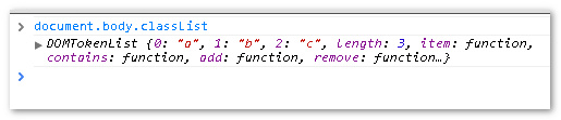 document.body.classList.add("c"); document.body.classList.length // 3此函数方法执行的返回值是
