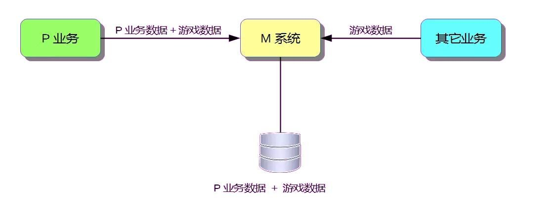 有的放矢我接手的第一个系统是一个后台系统,负责管理整个阿里游戏的游戏相关的数据(以下简称M系统),重构的主要原因是因为系统耦合了P业务独有的数据和所有业务公用的数据,导致可扩展性比较差。其大概架构如下: