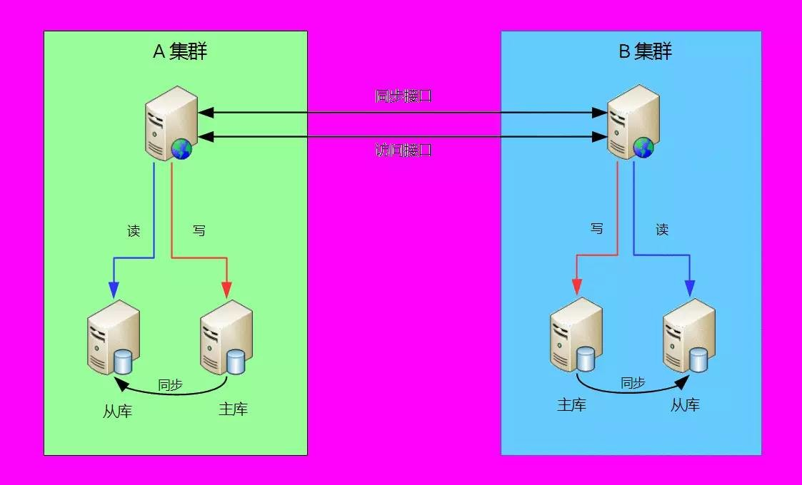 我接手的第二个系统,是负责游戏接入的核心系统(以下简称S系统)。S系统是游戏接入的核心系统,一旦S系统故障,大量游戏玩家就不能登录游戏,而S系统并不具备多中心的能力,一旦主机房宕机,整个S系统业务就不可用了。其大概架构如下,可以看出数据库主库是全局单点,一旦数据库主库不可用,两个集群的写业务都不可用了: