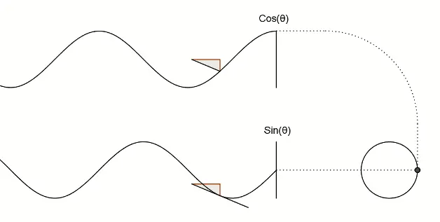 它们其实很直观地揭示了圆周坐标与三角函数的关系。图上所有的运动,都是通过不断增大自变量 θ 来驱动的。左边其实就是 sin 函数与 cos 函数的图像,右边代表的是经过映射后,一个作圆周运动的点。是不是很巧妙!现在看一点也不神秘了,你还可以用代码去实现它!