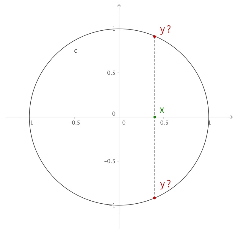 但为什么不能用不断递增的 x 呢?根据函数本身的特性,定义域中任意 x ,有且只有一个 y 与之相对应。所以在平面直角坐标系里,你无法找出一个“简单函数”直接画出圆。