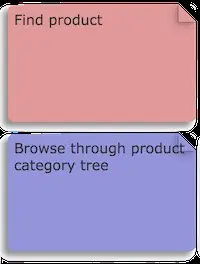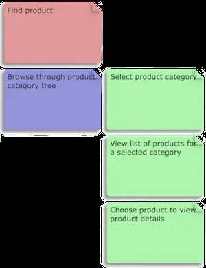 To achieve goal ‘Find product’ there are multiple ways such as ‘Browse through product category tree’, ‘Free text search’, ‘Promoted products’. Lets take one approach ‘Browse through product category tree’ to build our story map,