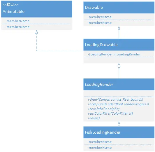 项目整体是采用了策略模式(Strategy)通过给LoadingDrawable设置不同的LoadingRenderer(渲染器) 来绘制不同的加载动画。Fish首先是继承了Drable类实现了Animate接口。