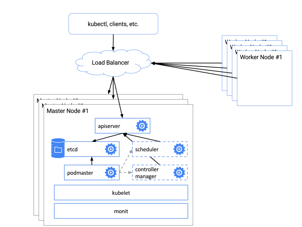高可用的情况下,由于用户的命令直接操作的是API Server,所以当API Server挂掉的时候,需要能自动重启。我们可以使用k8s客户端上现成的Kubelet来满足这个需求。Kubelet有一个Standalone模式,把启动API Server的描述文件丢到Kubelet的监视文件夹里就好了。当Kubelet发现API Server挂掉了,就会自动再启动一个API Server,反正新旧API Server连接的存储etcd还是原来那一个。API Server高可用了,要是Kubelet挂了呢?这个…还得监视一下Kubelet…可以用monit之类的东东,这边就不细说了。当然etcd也需要高可用,但是作为分布式存储来说,它的高可用相对而言较为简单并且跟k8s关联不大,这里也不提了。