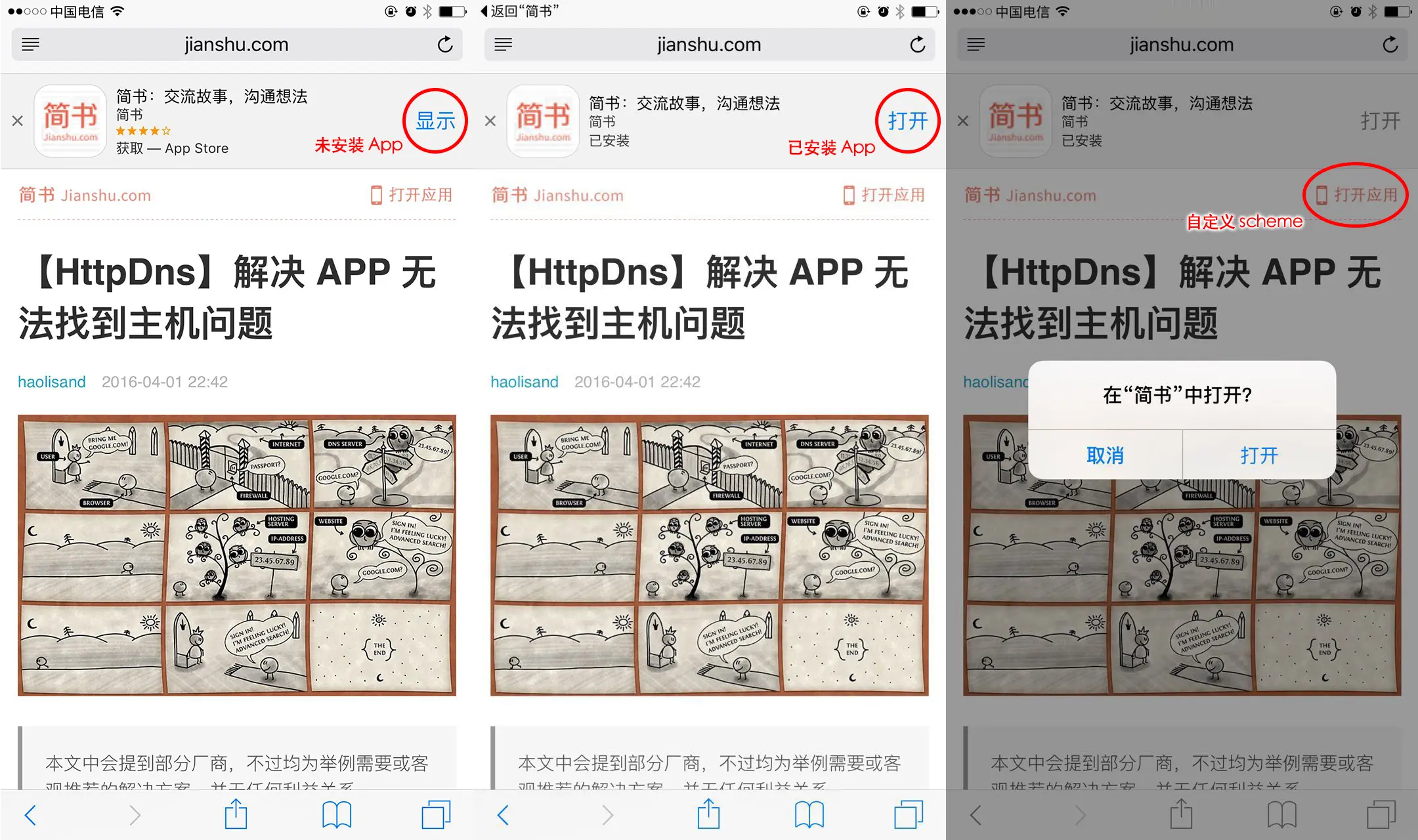 也可以利用来打开 App,例如简书点击 打开应用 按钮就会调用 jianshu:// 来尝试打开自己的 App,请参见上图第三幅。