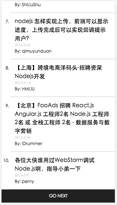 首先,我们需要获取目标数据,我选用了cnodejs.org社区的API作为例子进行编写。如果你也想用一个封装好的ajax库的话,应该这么做: