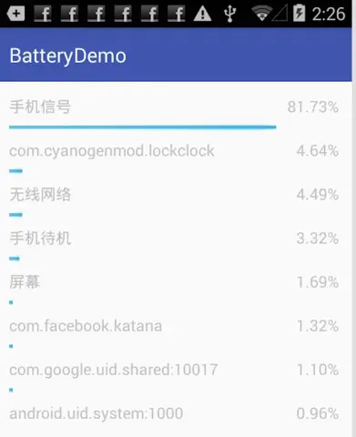 主要逻辑集中在compat层,实现了对应原生系统每个类的反射逻辑以调用getStatistics 为例:private byte[] getStatics() { try { Class serviceManagerClass = Class.forName("android.os.ServiceManager"); Method getServiceMethod = serviceManagerClass.getMethod("getService", java.lang.String.class); Object batteryStatsService = getServiceMethod.invoke(null, "batterystats"); Class batteryStatsStubClass = Class.forName("com.android.internal.app.IBatteryStats$Stub"); Object batteryStatsStubObject = batteryStatsStubClass.getMethod("asInterface", android.os.IBinder.class).invoke(null, batteryStatsService); return (byte[]) batteryStatsStubClass.getMethod("getStatistics").invoke(batteryStatsStubObject); } catch (NoSuchMethodException e) { e.printStackTrace(); } catch (IllegalAccessException e) { e.printStackTrace(); } catch (InvocationTargetException e) { e.printStackTrace(); } catch (ClassNotFoundException e) { e.printStackTrace(); } throw new UnsupportedOperationException("getStatics unsupport operation"); }运行结果